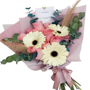 hermoso ramo de 3 Girasoles y 5 rosas decorado con lindos follajes.