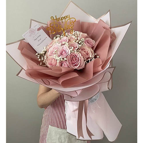 Hermoso ramo elaborado con 24 rosas rosadas acomplañado con gypsofilia