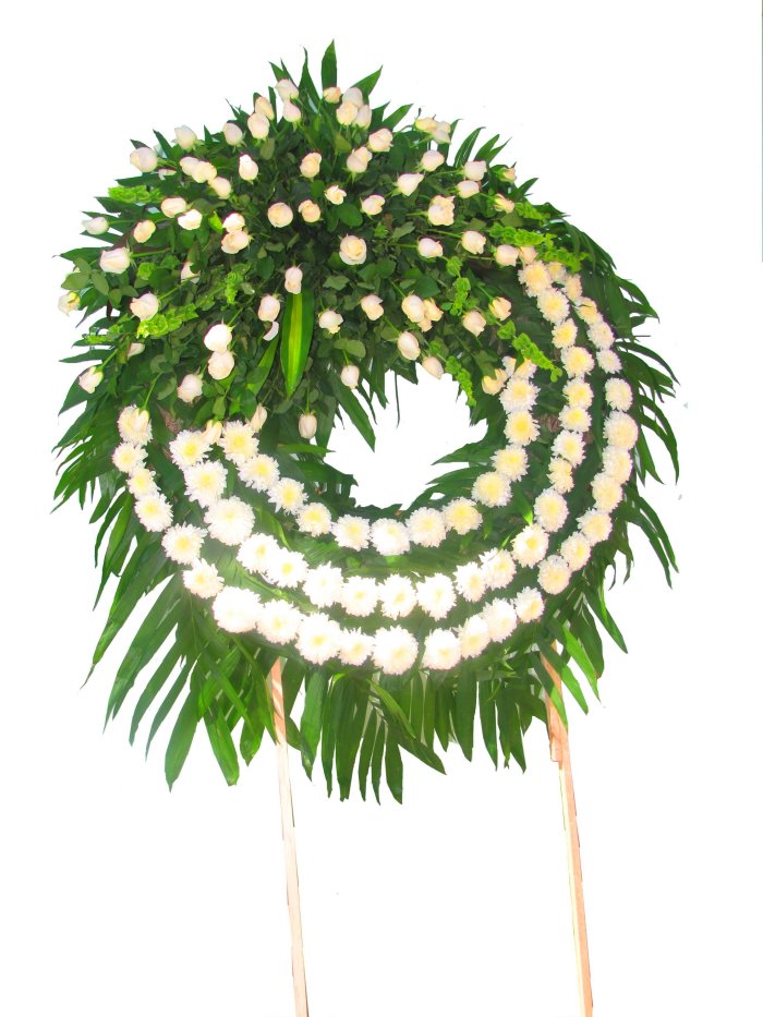 Corona de Rosas Blancas, Pompones, Campanitas, Maiceras y Finos Follajes