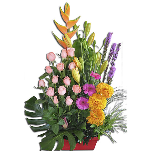 Exquisito diseño de 12 Rosas acompañado de Lilys y Gerbersas.
