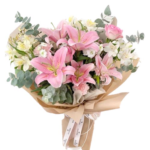 Bouquet elaborado con Stargazer, Astromelias, Dollar y Claveles.